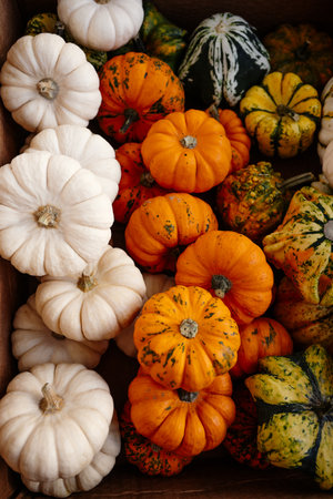 Bright orange and white miniature pumpkins and decorative gourds creating a rustic flat lay arrangement, symbolizing the cozy fall season and celebrating Halloween and Thanksgiving