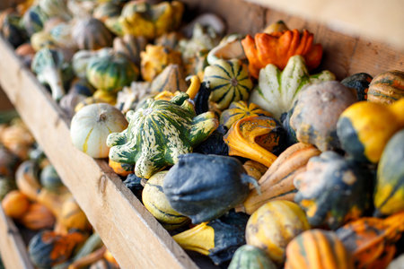 A colorful assortment of gourds and pumpkins in shades of orange, green, and white in a wooden crate. Halloween or Thanksgiving decoration in different colors and textures. Selective focus. Copy space