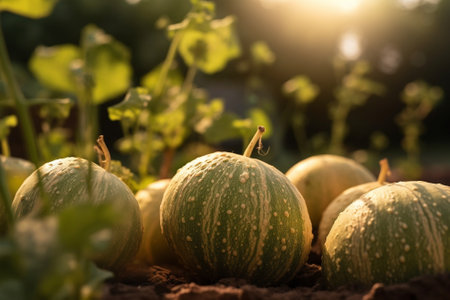 Decorative gourds or pumpkins among fall's colored leaves enlightened by sunset
