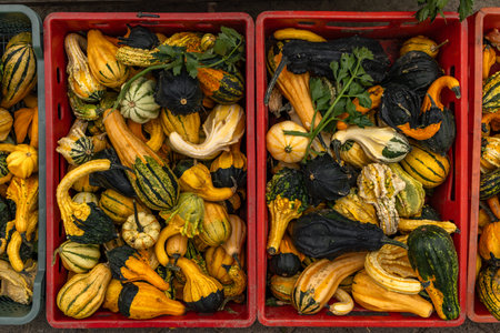 Freshly harvested decorative gourds displayed in plastic crates at a farmers market. A vibrant mix of yellow, green, orange, and black squashes in different shapes and textures. Perfect seasonal concept for autumn, harvest, Thanksgiving, and natural organic food.