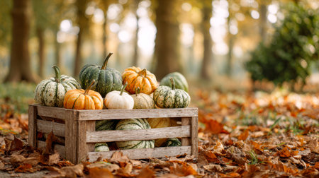 Warm sunlight bathes a weathered wooden box brimming with vibrant pumpkins, resting on amber leaves amid a peaceful forest setting.
