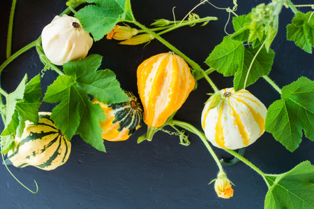 From above view of various kinds cute mini pumpkins placed in circle with copy space