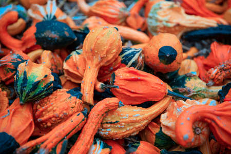 Group of beautiful decorative pumpkins of unusual shape, close-up on the market