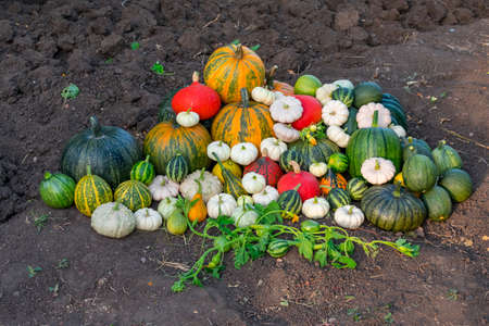 A bunch of different multi-colored pumpkins. Many pumpkins of different varieties. Autumn harvest of pumpkin. Harvesting in the village.