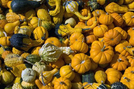 Assortment of decorative pumpkins for halloween and thanksgiving day. Autumn wallpaper, warm colors.