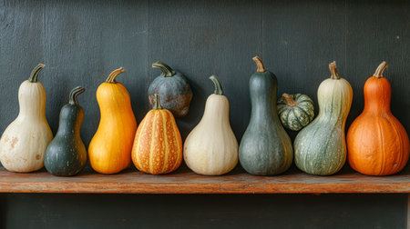 A vibrant display of pumpkins and gourds on a wooden table outdoors