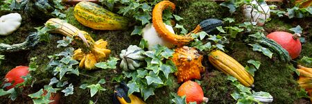 Decoration of differint varieties of pumpkins between moss and hedera plants