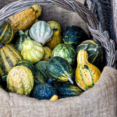 Decorative mini pumpkins and gourds in baskets on green market stand
