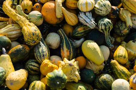 Mixed colorful ornamental pumpkins with various shapes. Autumn sunset light.