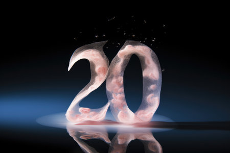 Close-up image of the number twenty, rendered in a 3D design style, with a textured metallic appearance and vibrant orange and purple hues. Water droplets and sparks add a dynamic, glowing effect to the image.