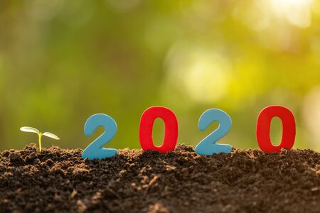 Color number 2020 and green young tree sprout growing in soil in garden blur background. For new year and environment concept