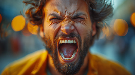 Close-up of a furious man with messy hair, shouting with his mouth wide open, revealing his teeth, expressing extreme anger and frustration
