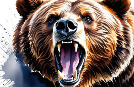 close up on muzzle of powerful North American brown grizzly bear roaring, watercolor illustration