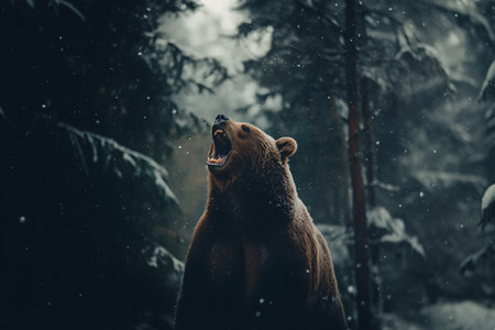 Powerful and Majestic Grizzly Bear Roaring in a Snowy Forest Landscape during Winter Season with Falling Snowflakes and Dramatic Atmosphere