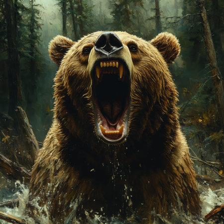 Fierce Grizzly Bear Roaring in Misty Forest