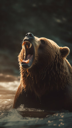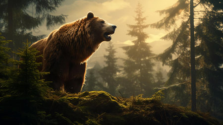 Captivating image of a wild brown bear roaring amidst the dense forest under warm evening light, invoking a sense of wilderness.