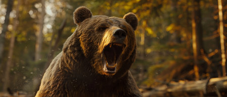 A detailed close-up of a ferocious brown bear roaring amidst the autumnal forest, capturing the raw power of wildlife.