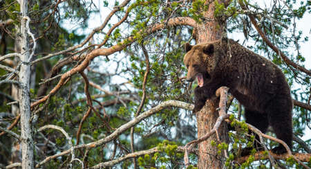 She-bear having scented danger, got on a Pine tree. Brown Bear (Ursus arctos). spring forest.