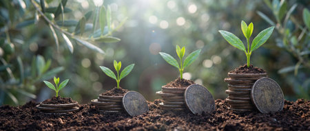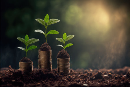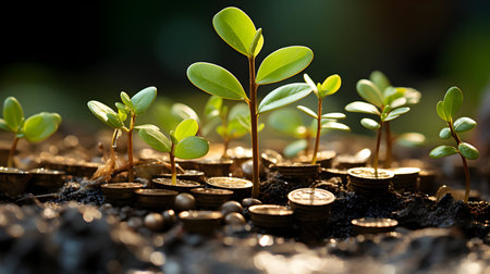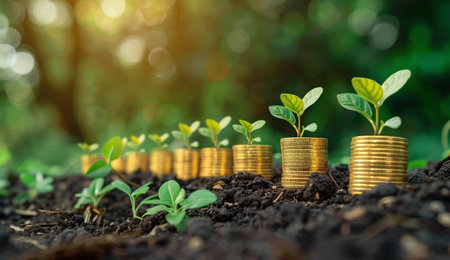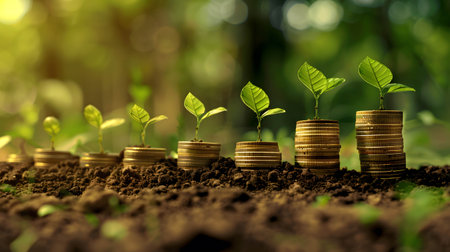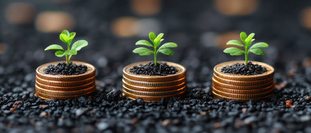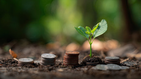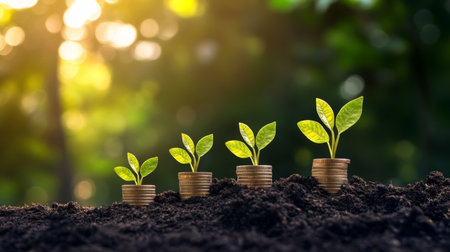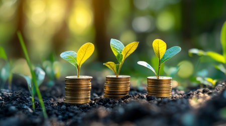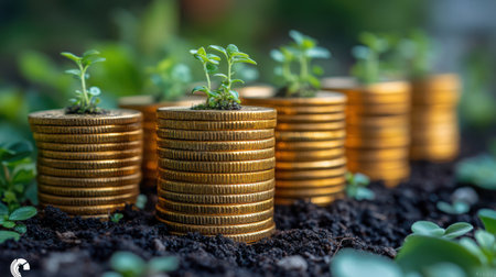 Growing plants on coins symbolize financial growth and investment. image showcases series of coins stacked with small green plants emerging from soil, representing prosperity and sustainability