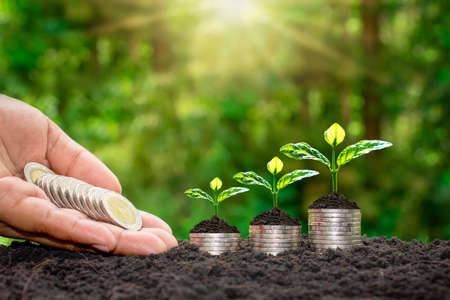 Growing plants on coins stacked on green blurred backgrounds and natural light with financial ideas