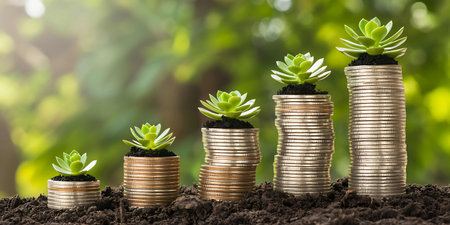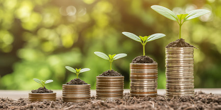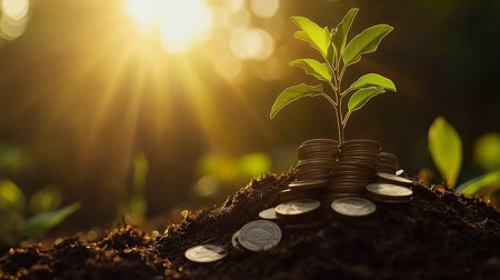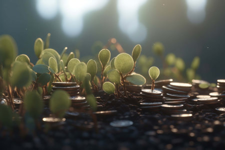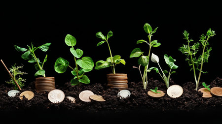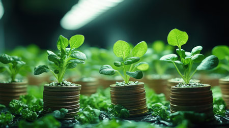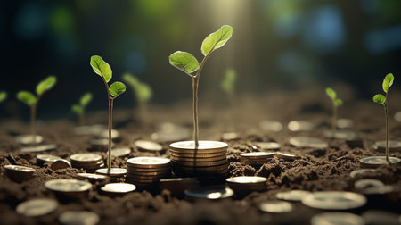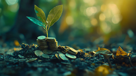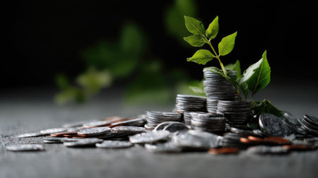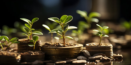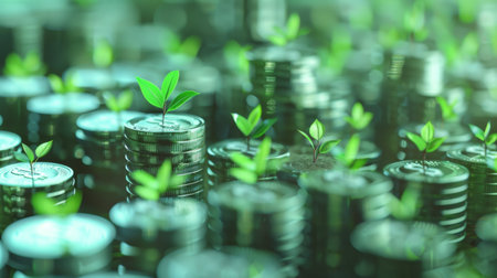 Conceptual image showing plants growing from stacks of coins, symbolizing financial growth, sustainability, and economic success in a modern context.