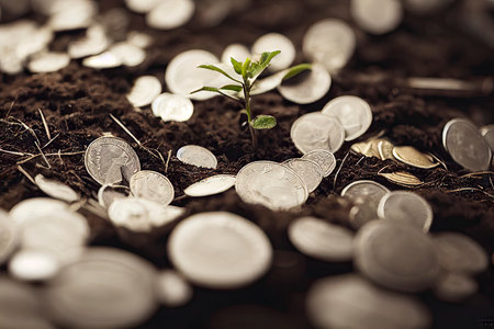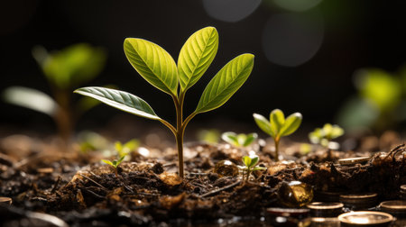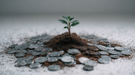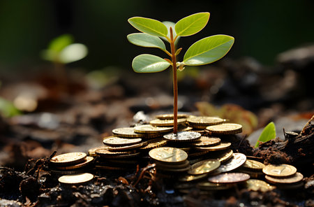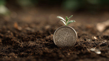 A vibrant green plant emerges from a mound of coins and soil, representing the intersection of nature and finance. This image symbolizes investment potential and the nurturing of sustainable growth in economic landscapes.
