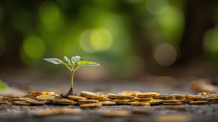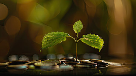 A small green plant thrives amidst a pile of gold coins, symbolizing wealth and prosperity. This image captures the essence of financial growth in a serene, natural environment.