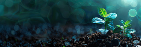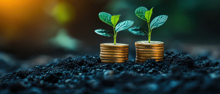 Two small plants sprout from stacks of coins, symbolizing growth and potential. The rich soil and vibrant greenery create a striking contrast with the shiny metal, showing nature's resilience..