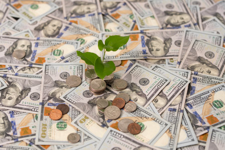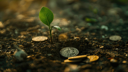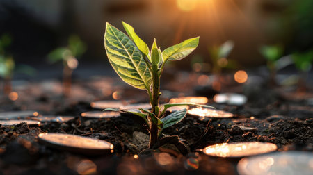 A vibrant sapling emerging from a coin on the ground, amidst other coins, symbolizing future growth and prosperity.