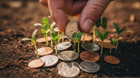 A person carefully tends to seedlings emerging from coins, symbolizing growth and investment in a lush setting.