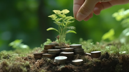 Hand gently places small plant on stack of coins, symbolizing growth and investment. scene conveys sense of hope and prosperity in natural setting