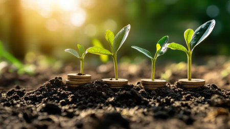 Four small green plants are growing from stacks of coins placed in rich dark soil under soft natural light symbolizing financial growth and investment success in a natural setting