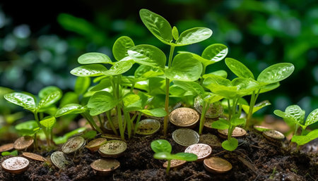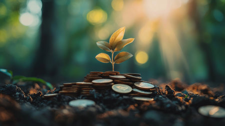 This image showcases tiny, emerging plants intermingled with coins. The scene features warm, golden sunlight filtering through a blurred background of green foliage. The composition suggests growth, prosperity, and the interconnectedness of nature and wealth, suitable for diverse commercial applications.