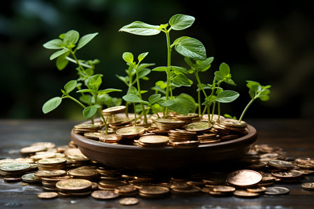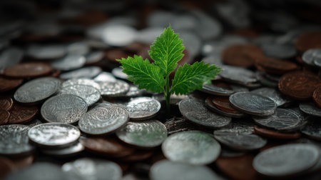 A vibrant green plant emerges from a dense pile of coins, representing the intersection of nature and finance, and symbolizing growth and prosperity.