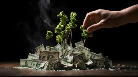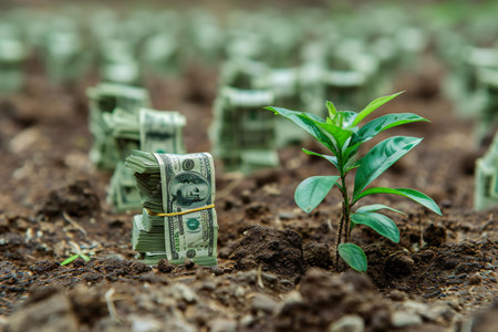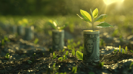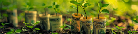 Rolled US dollar bills in soil sprout green plants, symbolizing financial growth and investment.
