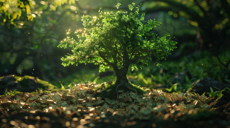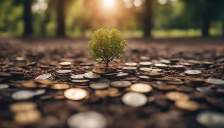 A small green plant grows from a stack of coins nestled in rich soil, surrounded by a lush green forest. This symbolizes the relationship between nature and wealth.