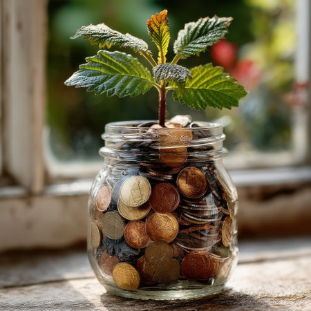 A small plant sprouts from a glass jar filled with various coins, symbolizing financial growth and investment. The scene is set against a sunlit window.