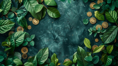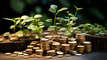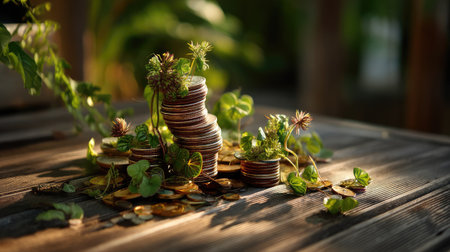 This captivating image features stacks of coins integrated with lush green plants, symbolizing the harmony between wealth and nature, showcasing growth and sustainability.
