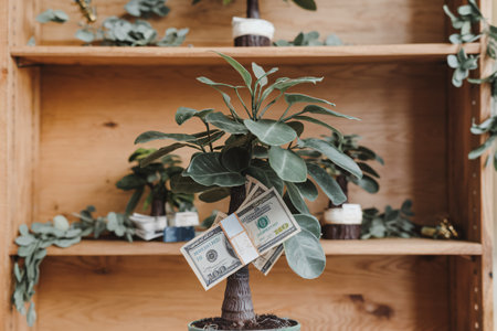 Money tree in pot with dollar banknotes on wooden shelf background.