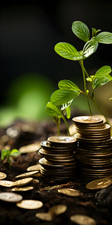 An inspiring image showcasing a small green plant emerging from soil, surrounded by stacked coins, symbolizing the harmony between nature and financial growth.