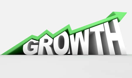 A green upward trend arrow moulded onto extruded white text that says grown on an isolated white background