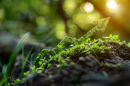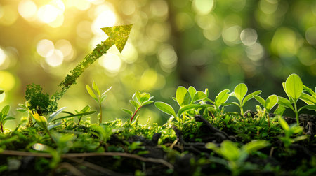 A vibrant image of green plants growing from rich soil, accompanied by a red arrow representing growth and success in business and environmental concepts.