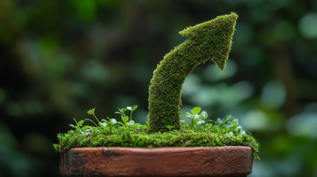Moss-covered upward arrow in a terracotta pot with small green plants, symbol of growth. Nature and sustainability concept