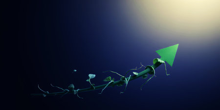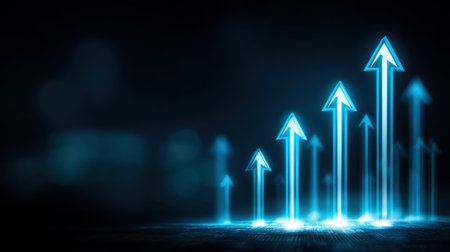 This abstract image illustrates the concept of growth and success, featuring glowing arrows pointing upward on a dark backdrop. It symbolizes ambition and progress.