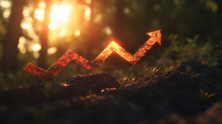 An artistic representation of growth with a rising arrow illuminated by sunlight in a natural forest setting, symbolizing success and progress.