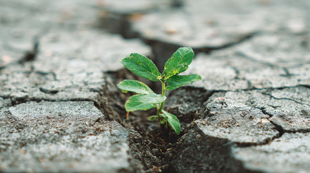 Resilient green plant emerges from cracked dry soil, symbolizing hope and perseverance in harsh conditions. This captures beauty of nature determination to thrive
