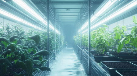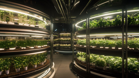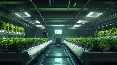 Explore a high-tech hydroponic farm interior showcasing advanced growing systems featuring fresh plants. Emphasizing sustainability and innovation in urban agriculture.