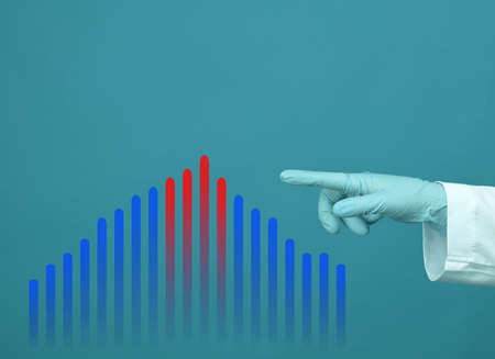 hand of a medic in a blue latex glove points to the graph, blue background. Disease Rise and Epidemic Decline Concept