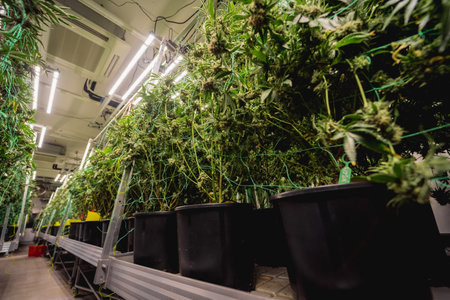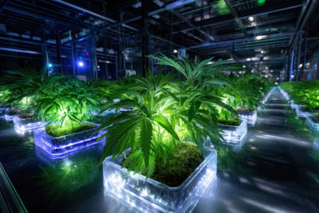 Cannabis plants thrive in an indoor growing facility, illuminated by LED lights in a controlled environment.