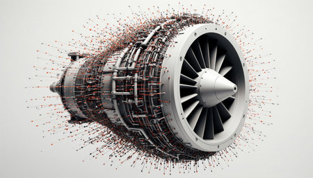 3d rendering of a jet engine on white background with red particles